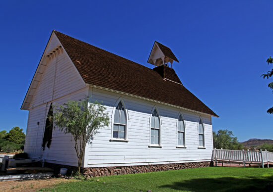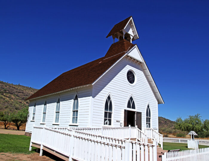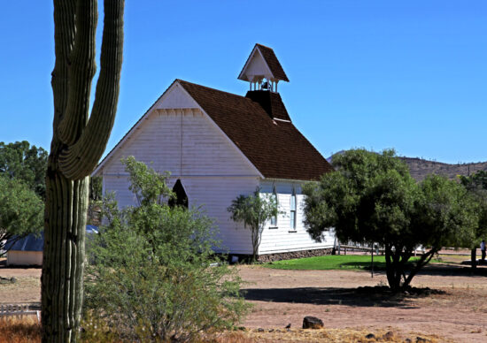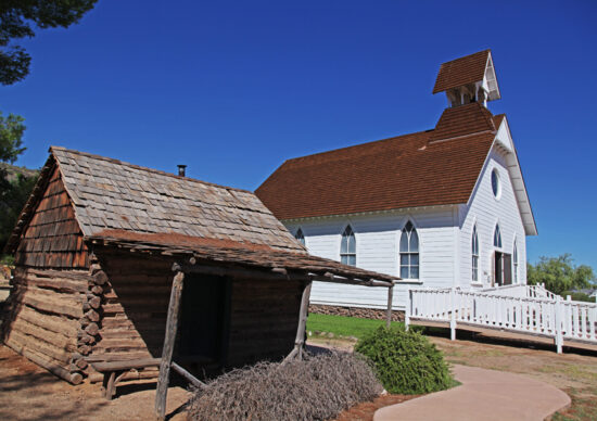 Community Church – This church is a precise reconstruction of the 1880 St. Paul’s Methodist Episcopal Church which was built in Globe, Arizona, to be a church home for Methodists who lived nearby. By 1927, the congregation had out-grown this building, so they had a farewell service on Sunday, September 11, 1927. They gave their pews to a Baptist Church in Globe.