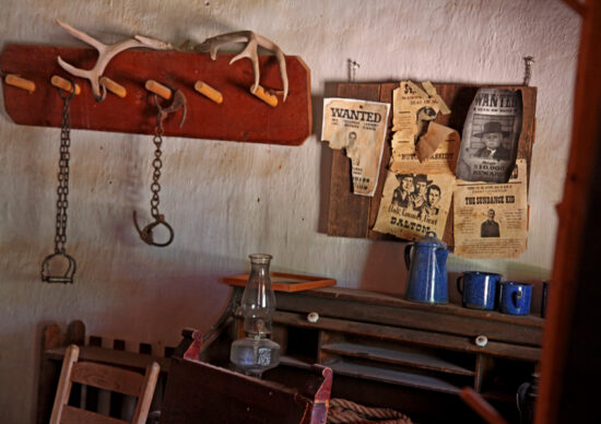 Looking inside, the visitor today can see how they made good use of the inadequate space in this small, rectangular building. The front half of this structure the visitor sees a gun rack, wanted board, shackles and other artifacts hanging on the wall. There is a small table, some chairs and a roll-top desk and chair.