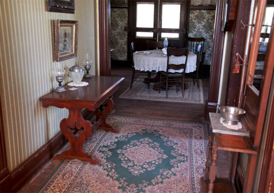 I would describe this 1890 Victorian style farm house as a practical, sturdy but pretty home with Victorian flourishes, especially seen on the roof area and woodwork of the front and side porch. There are also 2 decorative wooden pillars on the side walls before entering the dining room area. We were able to actually go inside because a staff member let us see it when we visited one hot July day in 2019.
