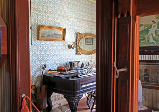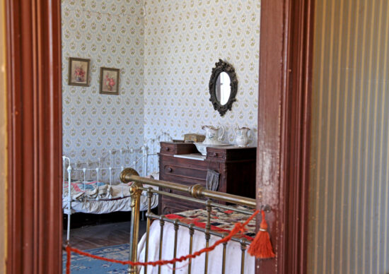 In 1969, the Sear home was scheduled to be knocked down in 30 days. The city told Pioneer Arizona that they could have it but their Foundation had to “scramble to raise the $5,000 needed to move it to the museum grounds” before the 30 days came. During restoration, a section of the original wallpaper was discovered beneath the dining room plate-rail, giving them a pattern to have in restoring this home to “depict a typical 1890’s middle class Phoenix dwelling with a parlor, music room, kitchen, and two bedrooms.”