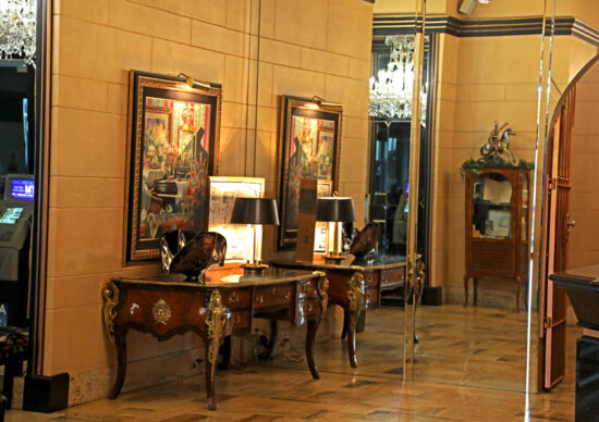 To the left of the check-in desk, there is a banquet room. To the right of the sign in desk, there is a lovely vintage lobby. There are two large, glorious mirrors on each side of the walls in the vintage lobby, making feel much bigger.