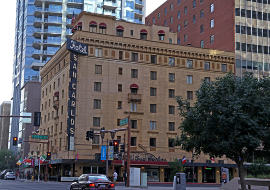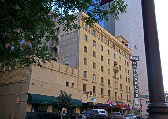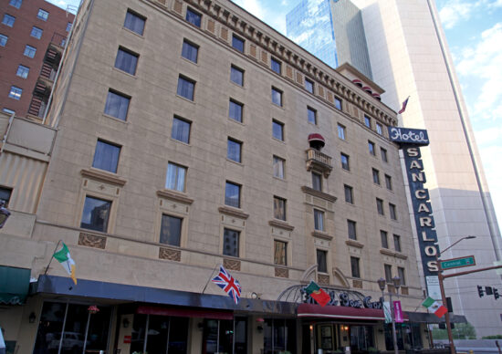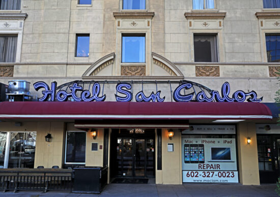 San Carlos Hotel is located on the corner of W. Van Buren Ave and N Central Ave. San Carlos Hotel is only six miles from the Sky Harbor International Airport and easily accessible to all major highways and activities. It is conveniently located near the convention center and other downtown Phoenix please of interest. The area is up and coming with excellent restaurants, entertainment within a short walk.