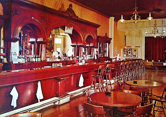 Using old photos, its historic decor was painstakingly recreated such as the huge mahogany bar and back bar. A false front second story was rebuilt where the second floor once stood.