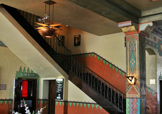 Tom and I walked into this vintage, two story, slightly spooky, spirit-supervised/haunted brick building. Its wonderful historic decor was a combination of Southwest Deco and a ’20s & ’30s fest! In the lounge area, a red-carpeted staircase leads up to the second floor. It is truly like stepping back in time.