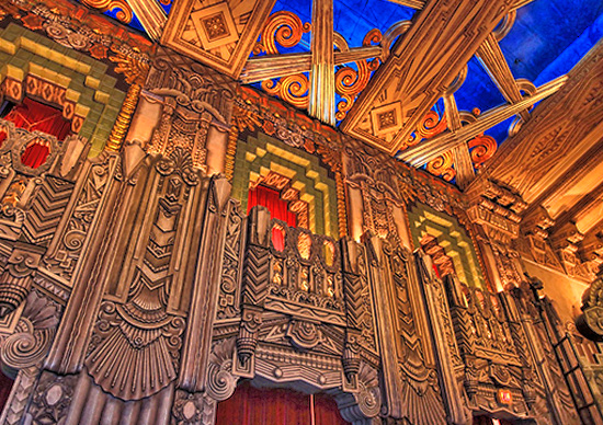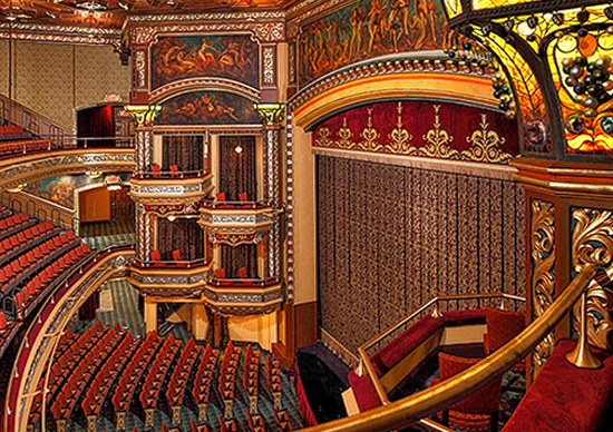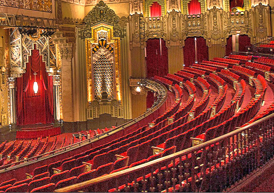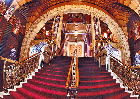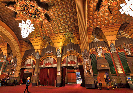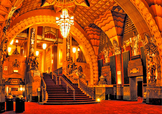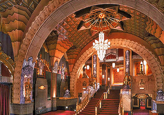 The large theatre auditorium is decorated in the Art Deco style in a grand, lavish way.