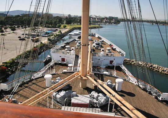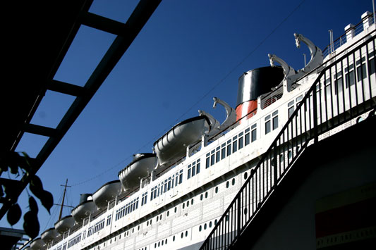 The Queen Mary is permanently docked in the Long Beach Harbor, next to the Catalina Cruise building, and in view of the Aquarium of the Pacific on the opposite shore.