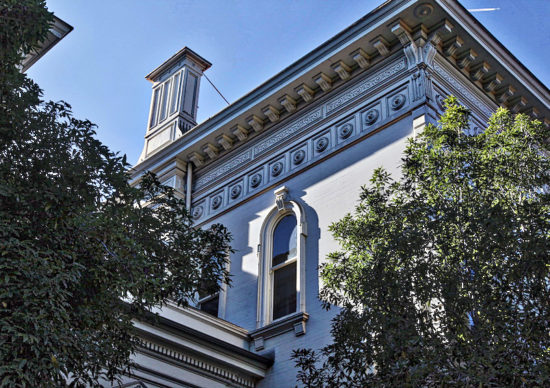 “One of the most remarkable features is the highly decorative fenestration. Tall, pedimented windows on the first floor are accompanied by second floor arched windows ensconced in layers of arched molding. All the windows have scrolled keystones and flanking pilasters. Centered among the windows on the second floor, is a faux palladium–like “window” with an elaborate shell pattern. The second floor windows look out on a large Renaissance balustraded balcony formed by the verandah roof. The Coleman mansion, like 15% of Italianate houses, originally had a seigniorial tower but it was removed in a remodel.”