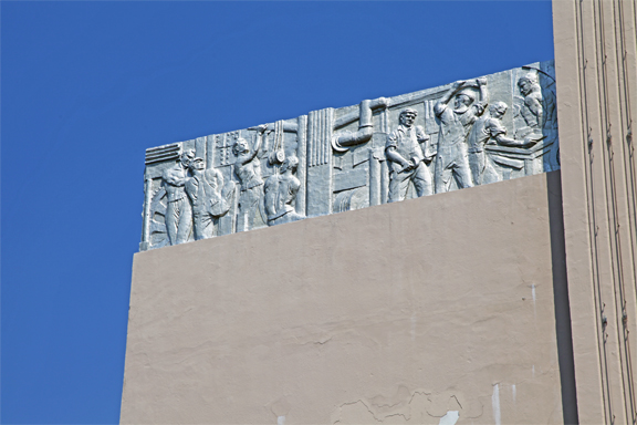 “They also re-gilded the bas-relief murals, depicting northern California occupations, which adorn the top of the concrete exterior facade. The reliefs hadn’t been gilded since the early 1950’s. Redding’s McHale Signs undertook the restoration of the blazing neon marquee, including the racing neon at the top of the vertical Cascade sign and neon tubing rising up the building’s facade, which hadn’t been fully lighted in this way in over 50 years.”