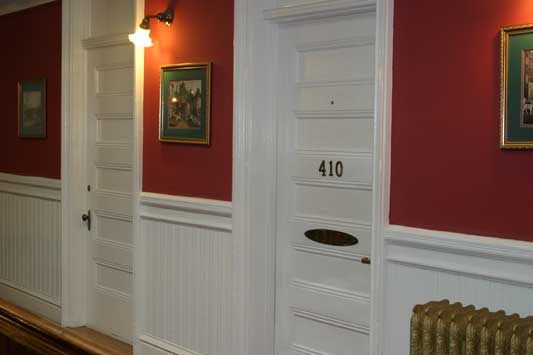 4) The fourth floor is the favorite place for manifestations to take place. The manifestations, mentioned above in 2 and 3, are the strongest in room 410, which once was her office and now is a lovely suite, complete with a sitting area and a fireplace.