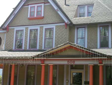 This 3 story, charming Victorian B & B Inn, is made up of two connected 1887 Victorian homes, offering 25 rooms for its guests. Whoever attached these two homes did a fabulous job! The old study, library and other rooms has been made into guest rooms, which are nicely decorated, and some have fireplaces.