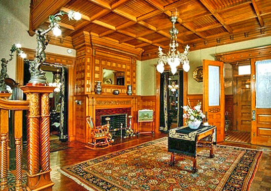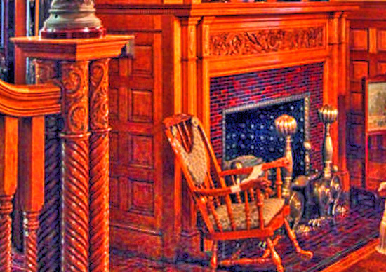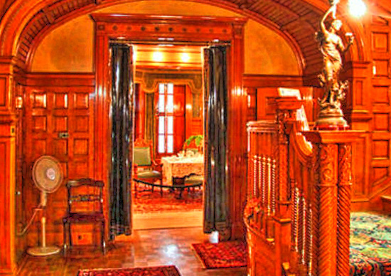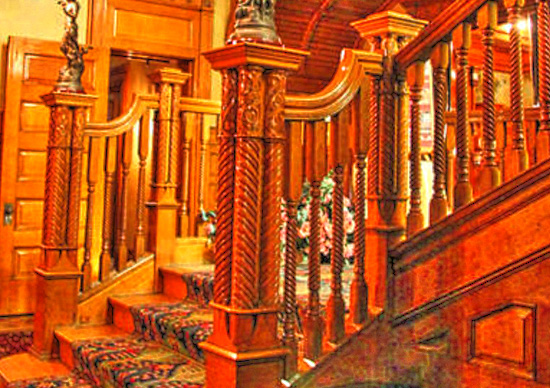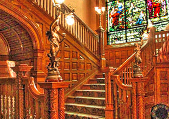 The Thatchers got a lot for their investment. It is no wonder this 24,000 sq. ft. 3 story mansion is called “Colorado’s Crown Jewel,” or referred to as a “Castle”, for it showcases the “Grandeur of a bygone era.” Rosemount Mansion was built with Castle Rock, Colorado pink volcanic stone using the Richardsonian Romanesque style. Inside the mansion, the exquisite woodwork features beautiful oak, cherry, maple and mahogany, used in various ways, like custom paneling. The impressive entrance hall is constructed with golden oak wood and has a coffered ceiling from which hangs the largest of the mansion’s Tiffany chandeliers. The oak staircase is described as being “dramatic” and connects the floors of the mansion.