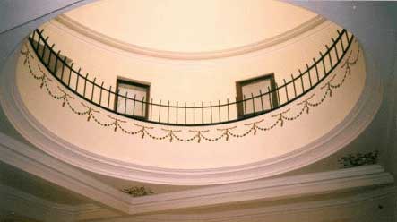 Also one sees “secondary roofs, which are capped with orbs, provide decoration and balance in relation to the central dome. Encircling the building are Medallions and a wide frieze band. Dominated by full-height porticos and supported by Corinthian columns, the north and south facades feature classical pediments ornamented with applied garlands and vent shields. Brick was used as the exterior wall fabric, and double hung sash windows provided natural interior lighting.”