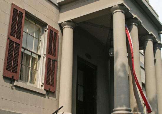The home features a columned portico, and double stairway. A beautiful iron fence encloses a lovely Victorian garden. The top floor and addition were added in 1886.