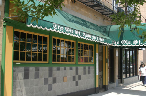 Ole St. Andrew’s Inn is on the first floor of a rather drab two story brick building. It has a cheerful green awning, which runs above the colorful yellow-trimmed windows and runs out over the sidewalk to the street, in a half circle shape, offering shade from the hot sun. It has a serious wooden door leading inside. Unfortunately, it was closed on the day Tom and I came by for a visit during our 2007 summer road trip, so I relied on other sources to describe the inside of this friendly, popular neighborhood watering hole and eatery…