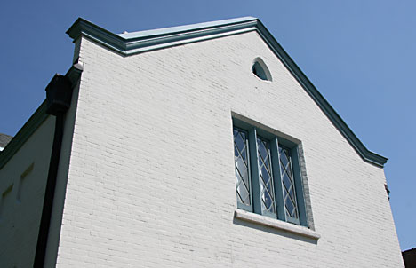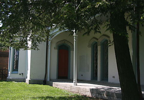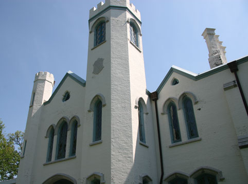 When we finally found and traveled down Castlewood Avenue, suddenly it appeared on the right. Loudoun is made of brick painted white, dusted and covered with layers of sand and paint to resemble stone. It is quite impressive with its length and Gothic Revival architecture, presenting a mansion that is uniquely different, and must have turned heads throughout its long existence. The mansion is long, shallow, and two storied, with lovely castle-like towers framing its grand entry way. The “crenellated” tower on the right of the main entrance is bigger, and probably holds a study at the top, because there are four large, rounded stained glass windows, adding beauty to both the outside appearance and for the room inside. The rounded window arches above the long, rounded at the top rectangular windows are made of limestone, and the roof is a handsome slate. The roof line is interesting, with all its turrets, “parapet” walls, and pinnacles on the important gables. Peeking in the windows of the closed mansion, one sees large rooms for serious parties/assemblies, now used for events sponsored by the Lexington Art League. The woodwork inside is all walnut.
