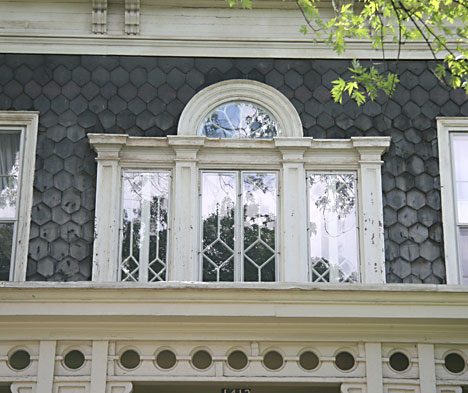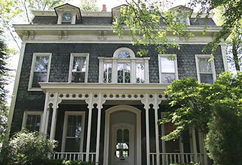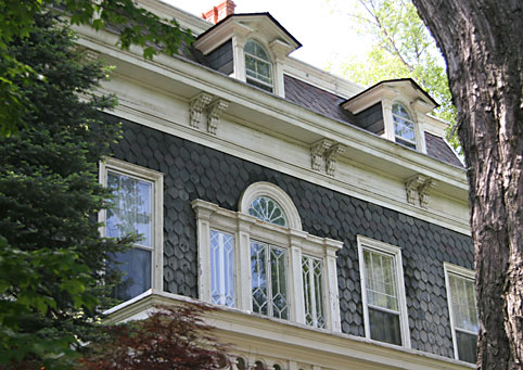 It is a three story, New England style building with very pretty windows, white-washed trim, grey clapboard shingles, mansard, grey slate roof and a delicate, yet grand decor, which is different from any building in Louisville.