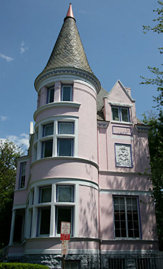 This pink-colored, large, three story, 1891 brick, Eclectic with Chateauesque detailed Victorian Mansion has architecture which was inspired by French Chateau’s designs, including a spiked, steeply rounded turret roof, which sits upon a rounded section in the front of the mansion. This rounded section has three long observation windows on each floor, giving a glorious view of the neighborhood and park from a strategic position. Besides having Parkay floors, lovely original woodwork, this old dame has lots of nice touches in the Victorian decor and antique style furnishings. The grand staircase is framed with double arches and connects to all the floors.