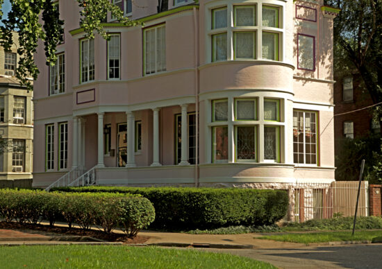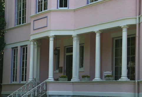 The Pink Palace can be found on the southern end of the lovely St. James Court Street; a street which is home to many lovely Victorian mansions. Constructed originally for the first well-to-do owners of these homes, St. James Court St. has a long, beautiful rectangular park area, running down the middle of this street. The end of this park strip is oval at each end of St. James Court. In the middle of this delightful greenery is a lovely fountain. Weddings and other events can be held in this area.