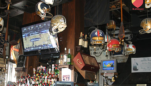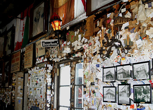 On the first floor, the room in the front is still the home of The Jean Lafitte’s Old Absinthe House Tavern. Its decor is a wonderful mix of the past and present. Along with the antique chandeliers, an 1860s lovely copper-colored wooden bar that can seat 50 patrons, marble fountains and brass faucets, one sees jerseys and helmets of beloved football heroes and legends, hanging from the bar’s cypress beams up above it all. The walls are covered with business cards of their patrons. The walls throughout this incredible building are covered in the framed photographs of several of their famous patrons.