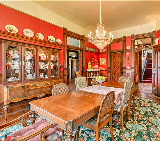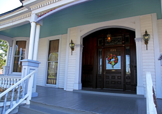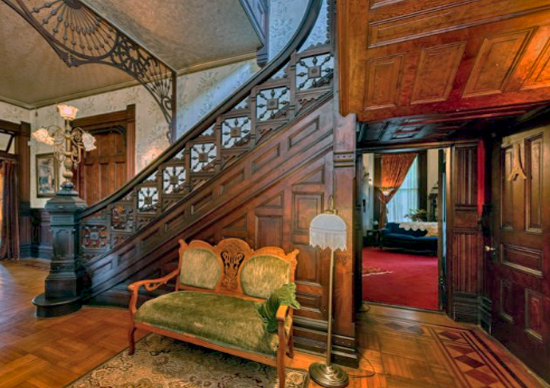 The 1897 Logan Victorian Mansion is stunning outside and inside as well. As the visitor walks up the steps, there is a fabulous wooden door and an impressive wooden decor around the door and porch area by the front door. The Logans designed a grand space outside for visitors before going into the grand foyer!