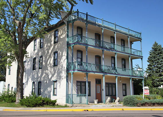 This well- built 1895 historic old West Victorian railroad hotel is a large, rectangular, 3 story turn-of-the-century building, complete with 3 porches for each floor. It has been painted yellow, with green and purple trim around the beautiful Victorian windows, doors and railings.