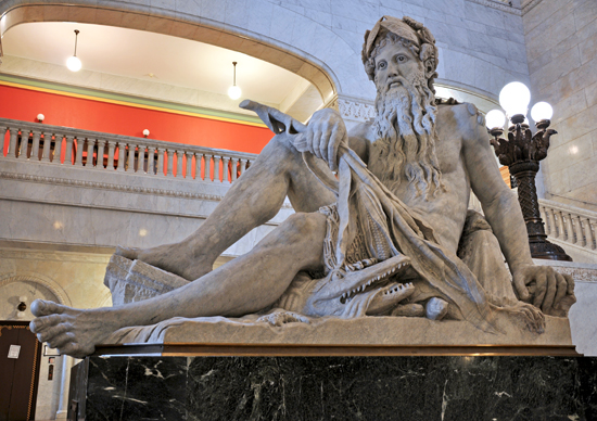 There originally was a large courtyard in the middle of the building, but as time went on, a few buildings were built in this space to relieve crowding. The steep roof was originally terra cotta, which was covered in copper in the 1940s when the roof began to leak. This building also has a rotunda, which is the home of a large, 1906 sculpture, entitled “Father of the Waters”, which was created by an American who had lived in Florence, artist Larkin Goldsmith Mead.