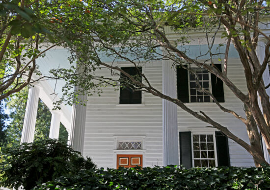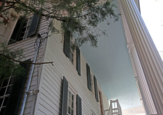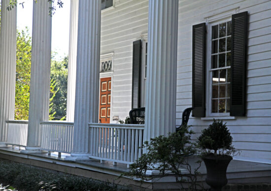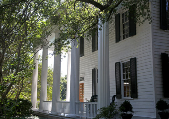 Yes indeed! There are grand colonnades of five Greek Pillars along the front and along the sides, that appeared after the Harris family remodeled in 1854 the mansion to be more Greek Revival. Apparently Greek Revival was the style to have in 1854! They hold up large porticos on each side of the mansion. The original enclosed front porch was taken out to make room for the massive structure needed to support the portico.
