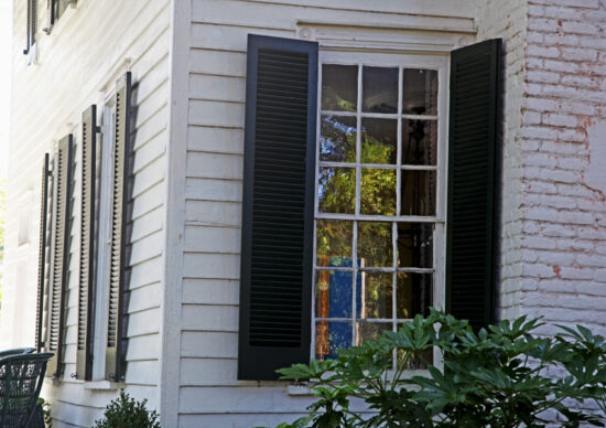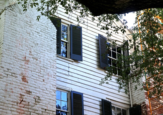 “Built into the side of the hill, the nearly square, clapboarded, gable-roofed structure stands two and a half stories high, with a full basement under the southern or rear portion. Exterior paved, single-shoulder chimneys on the western elevation are laid in common bond. Nine-over-nine windows on the first level of the three-bay dwelling diminish to six-over-nine on the second and third levels. All windows feature Grecian sur- rounds set with end blocks and are fitted with operable louvered blinds that retain their original latch-type hardware.”