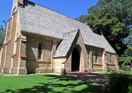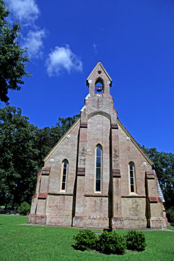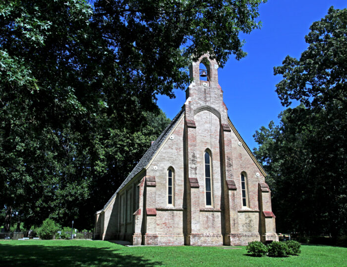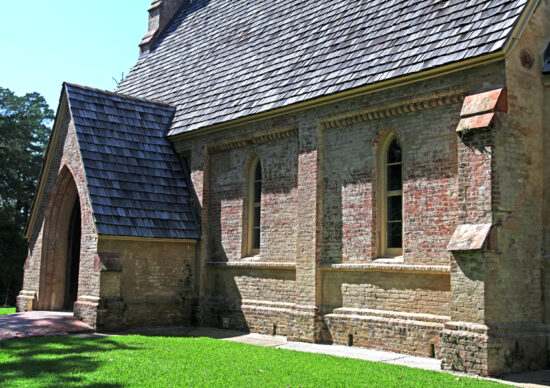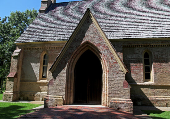 This brick chapel is a Gothic-style masterpiece, complete with a pointed arch front doorway and with sharply-tipped windows. This chapel was built by Mrs. Margaret Johnston, in memory of her husband, and was finished in 1855, complete with French stained glass windows, a pipe organ, a baptismal font made from one stone, altar and communion rail.
