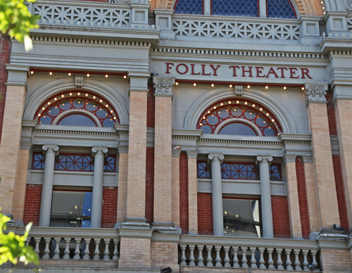 WOW! Tom and I were amazed at how beautiful the Folly Theatre is on the outside when we visited this place at the corner of Central and 12th Streets. It truly is a handsome theatre; inside and outside, using the Neo-classic style in a grand manner. Besides the delightful ornamental trim and gorgeous windows, the primary facade features a handsome, Neo-classic Palladian motif. On the street, there are three arched entrances, each flanked by rusticated pilasters. The Palladian Arch window, which “dominates the street facade is supported by the four central pilasters.”…