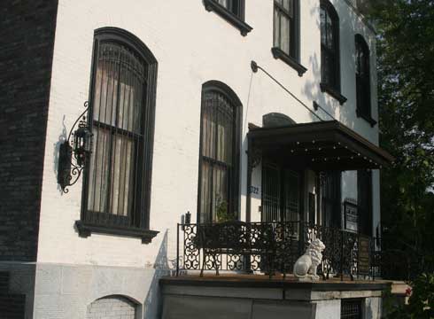 The William Lemp Suite – Consists of bed and sitting rooms with decorum and splendor that the original residents, William Lemp and his wife would surely be pleased with. Splendor and romance abound in this room. Besides having “rich carpeting, authentic chandeliers and vintage marble -topped walnut furniture,” the suite has a glorious view out the front window of the massive Lemp Brewery, a lovely view out the window by the breakfast sitting room of the beautiful terraced courtyard, garden area and gazebo, used for outdoor weddings. The old coach house can be seen as well, where the family’s champion horses were stabled.