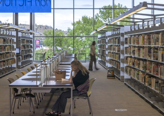 The Parmly Billings Library is a large, square, red brick building that has 6 floors plus a basement, and is full of everything a modern library offers its citizens, including many book collections, resource materials, DVDs, books on tape, and music. The outside structure is definitely a 1955 style building, but the interior has been renovated into a modern library to house its marvelous collections, computers, etc…