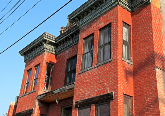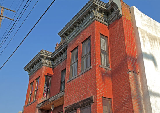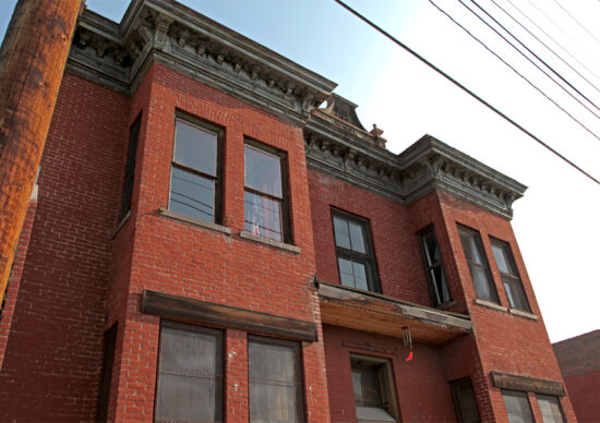 The Dumas Brothel is a two story, Victorian brick building, with 4 large windows in the front, framing the doorway, with lovely, copper dentils along the roof line. This handsome building has a long, notorious reputation as a house that sold sensual pleasure to the common miner and the well-to-do as well.