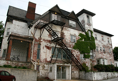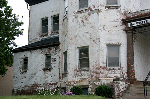 What is now called The White House Apartments is a three story, Italianate Victorian, immense brick building which is mostly painted white, though it is in need of some major TLC and a new coat of paint. The white paint is peeling off most parts of the building, giving it a funky, run down fixer upper aura. The oldest part of the building, with the steep roof, wooden siding at the top, tall brick fireplace chimney, castle like tower (see Loudoun House/KY) whose small, once pretty wooden entryway faces S. 10th Street, probably was once someone’s huge Victorian home, probably built in the late 1890s or early 1900s; before or around 1910…
