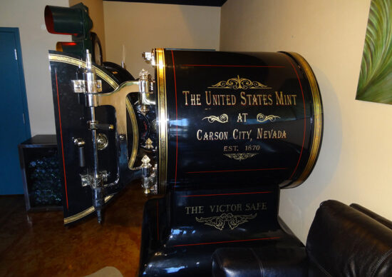 Because of the flow of silver coming from the Comstock Lode, Carson City was picked by Congress in 1863 to be the location of a national mint. Because of the Civil War, ground wasn’t broken until 1866. Carson City founder, Abraham Curry was one of the three planning commissioners, and was the superintendent of construction of this handsome, sandstone building. It opened as a national mint in 1869. From 1870-1893, this mint produced $49,000,000 of gold and silver coins were minted here.