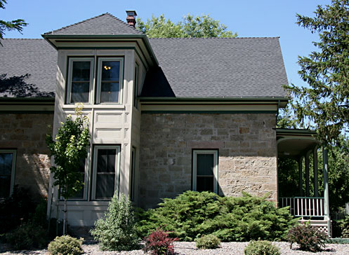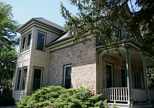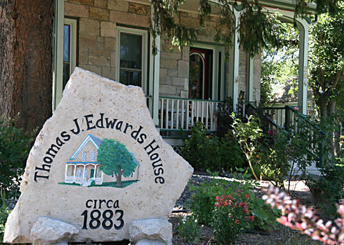 The 1883 Thomas J. Edwards House is a solidly-built, two story, unusually multicolored, brown, rose and white sandstone Victorian home, with lovely green and white wood trim, and two Victorian chimneys. The front part of the home is rectangular, with a square, tower-like sectioned bay window right in the middle, on both floors. There is an addition on the back of the house. A small, well-done front porch overlooks the lovely front yard, which is a glorious sea of flowers and lovely landscaping.