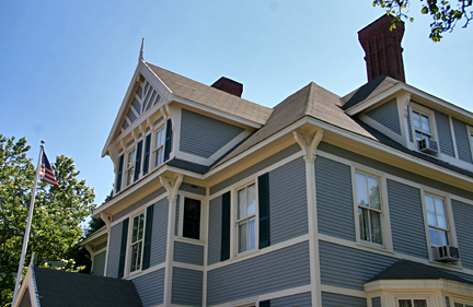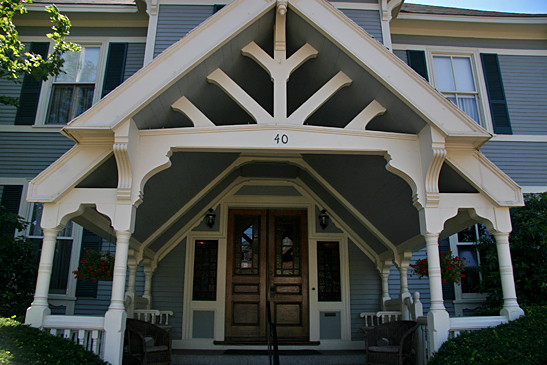 This 1881 Queen Anne style mansion-turned-inn, has three stories, a ground floor, plus a “bright atrium,” that was part of the contemporary addition that was added on by the owners, when the old mansion was renovated and made into an inn, in 1986. The inside of the now upscale Sise Inn features beautiful butter wood paneling, a Victorian atmosphere, complete with lovely antique furniture that fills every room, and complements the modern touches added; like a brass elevator door.