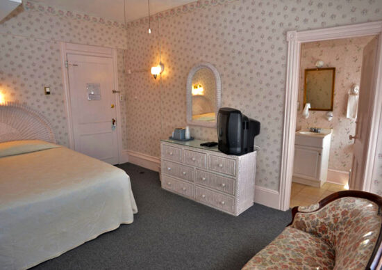 The 1894 Victorian-style, five storied Inn of Cape May is the commanding presence on a very large property lot on the corner of Beach Street and Ocean street. Walking into the Inn’s lobby and common rooms is very much like stepping back in time with glorious Victorian decor and furniture, chandeliers and a huge fireplace. Their antique elevator that is run by a staff member even has a chandelier!