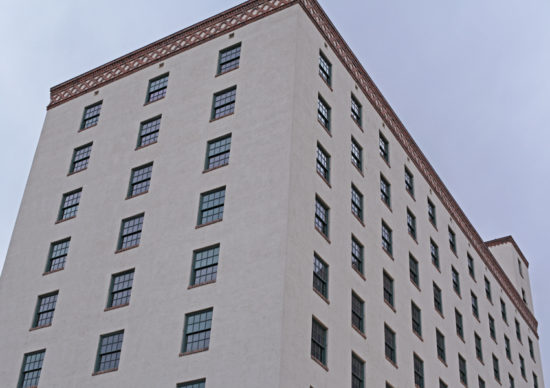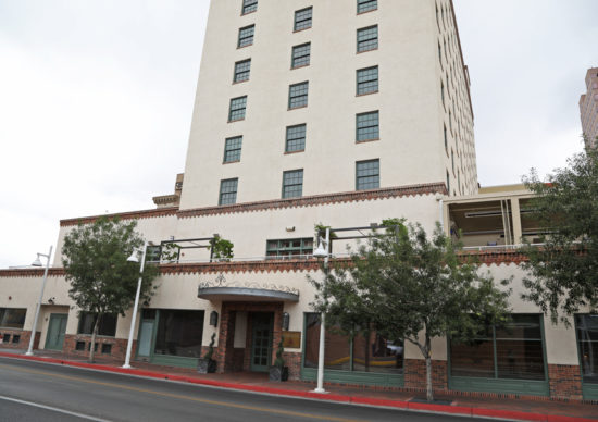 “It featured a two-story ground floor to house the lobby, restaurant/bar, and ballrooms, while an eight-story tower contained the guest rooms. The hotel has a modernist form, but distinctive Southwestern styling with stuccoed walls and Territorial Revival brick coping along rooflines, decorative and functional features in metal and wood, and an arcaded lobby.”