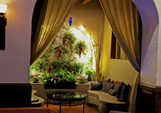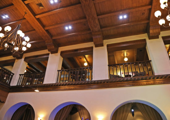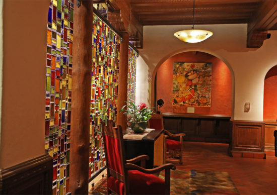 The decor in the two story lobby can be described as being “Moroccan meets New Mexican vibe.” We admired the attention-to-detail woodwork; especially the expansive, beamed ceiling and other hand-carved accents, glorious stained glass, and arches, a beautiful fountain and the unique secluded alcoves; called Casbahs. In the lobby, there is also beautiful leather furniture, and tile and ironwork that showcase the Spanish Andaluz region. Equally impressive are the original 1930s’ murals from the Conrad Hill era that display scenes from New Mexico’s history; found in the Hotel Andaluz’s entry walk ways.