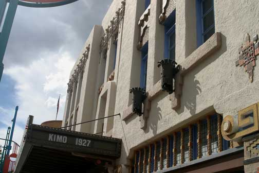 The interior of the KiMo Theater is stunning. One will find “plaster ceiling beams textured to look like logs and painted with dance and hunt scenes, air vents disguised as Navajo rugs, chandeliers shaped like war drums and Native American funeral canoes, wrought iron birds descending the stairs and rows of garlanded buffalo skulls with eerie, glowing amber eyes.”
