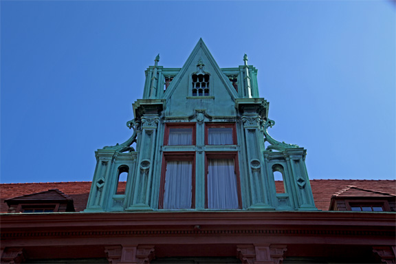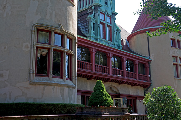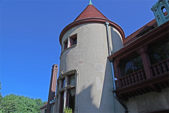 Sitting on a 32 acre piece of property, now known as Coindre Hall Park, The Chateau at Coindre Hall is a 40 room, 30,000-square-foot mansion built in the style of a French Medieval castle, modeled after a chateau in southern France. To complement the French medieval architecture, builders added “red-clay, tile-hipped roofs, prominent circular towers with conical grooves and elongated decorative brick chimneys.”