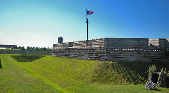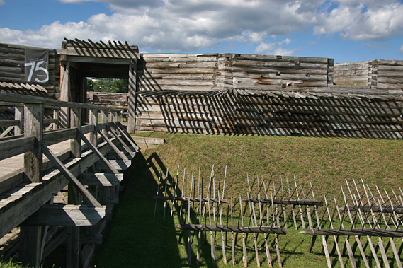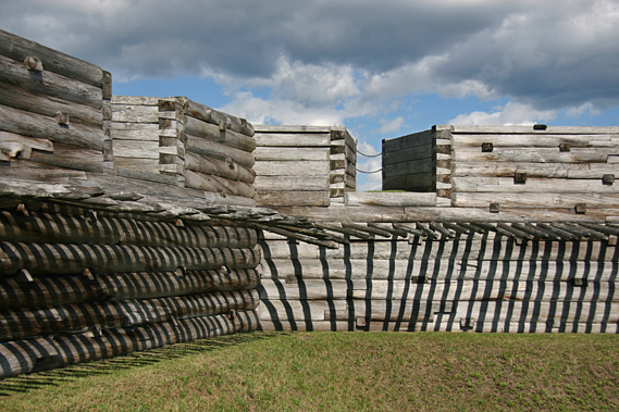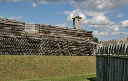 While the original fort was made of timber, this new facsimile of this fort, in the shape of a 220 ft. by 220 ft. square, is made of reinforced concrete, covered with soil, and faced with half-timbers. Off of each corner of the fort, pentagonal bastions were built, 36 ft. by 90 ft. square, in the style of the original fort. Adding the bastions to the size of the square shape of the fort, makes its total footage, 330 ft by 330 ft. square. The berm was put in place on 3 sides of the fort, “followed by a ditch, a parapet, and a glacis”. The meadow surrounding the fort on the grounds allotted this national monument is kept in its 18th century appearance, looking much like it did when the fort was an active structure.