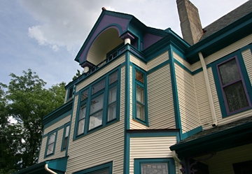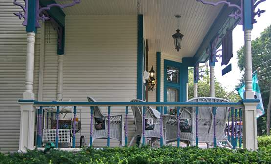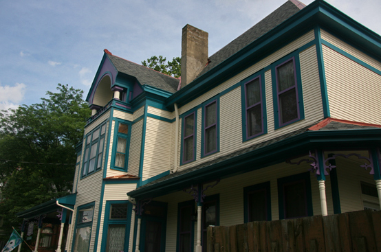 The outside of the home is very Victorian indeed, with bright colors, and outside wrap-around porch, with even a turret on the top of the roof!