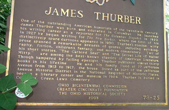 They only lived here for a time in this home; one of the three houses the Thurber family lived in Columbus, during the time that James Thurber was attending Ohio State University. This home was 45 minute streetcar ride away. Because he couldn’t complete the required ROTC course at Ohio State, he wasn’t able to graduate from college, but was given a posthumous degree, after a life-time of literary contributions and cartoon fun! His natural talent and gifts opened doors of opportunity for him, even without a college degree. “Although best known for his funny cartoons and witty short stories, James wrote 32 books, collections of essays and modern commentaries, fables and children’s stories.”