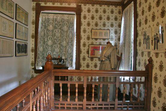 It is described as a 1875 brick, charming Victorian, built for a 1910, middle class family, but whose curb appeal and charming interior made it a very popular rental, attracting many good tenants. It has the customary two floors, with the attic turned into a small apartment for resident writers, not open to the public. Though on a smaller scale, compared to the robber baron homes, its décor is simpler, yet with beautiful Victorian era touches, including lots of wood, some beveled glass, and lovely ceramic fireplaces. Well-known, honored cartoonist and witty short story author James Thurber, lived with his parents and was the middle son of three Thurber boys; William, the eldest and Robert the youngest. The three of them must have been a handful. James lost his sight in one eye while playing William Tell with his brothers. He went totally blind later in life.