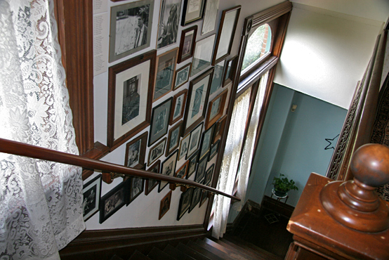 Along the walls of the second floor between the bedrooms, pictures of the Thurber Family and important family documents are hung. Also a photograph of a see-through apparition that was taken on one of the staircases is hung on the wall on the second floor landing. Down the back staircase, that leads to the dining room, one can see the “Wall of Fame; pictures of all the authors who visited Thurber House and/or participated in the Thurber House’s literary programs.