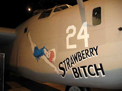 B-24 Liberator — The “Strawberry Bitch” — Served with the 512th Bomb Squadron, 376th Bomb Group of the 15th Air Force based in Libya and Italy. It had interesting nose art. Some say that the red-headed babe painted on the side had not a stitch of clothing on, when the plane was serving in action.
