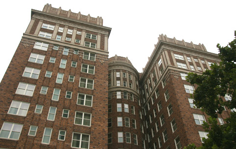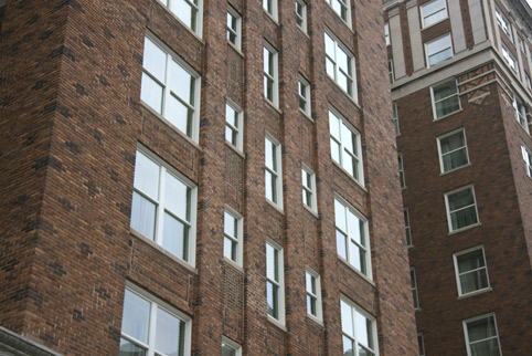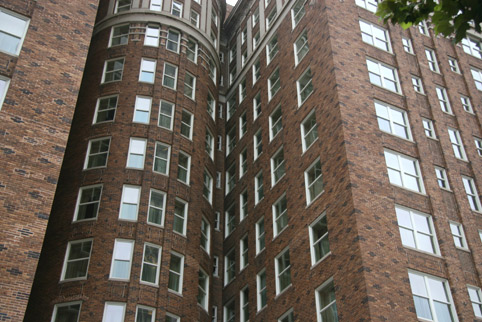 WOW! What a gorgeous, impressive hotel. Tom and I finally found it, but it was well worth the effort. There are 3 square, 14 story wings, with 2 rounded bay buildings in between the wings. The brickwork is in a Flemish bond pattern, with the lower levels being faced with limestone. The high-ceiling lobby is decorated in English Gothic decor, and takes one’s breath away. Check out the pictures