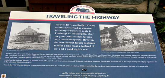 The Jean Bonnet Tavern and Inn is located near the intersection of Old Forbes Road and Burd Roads; Routes 30 and 31, on the outskirts of Bedford.